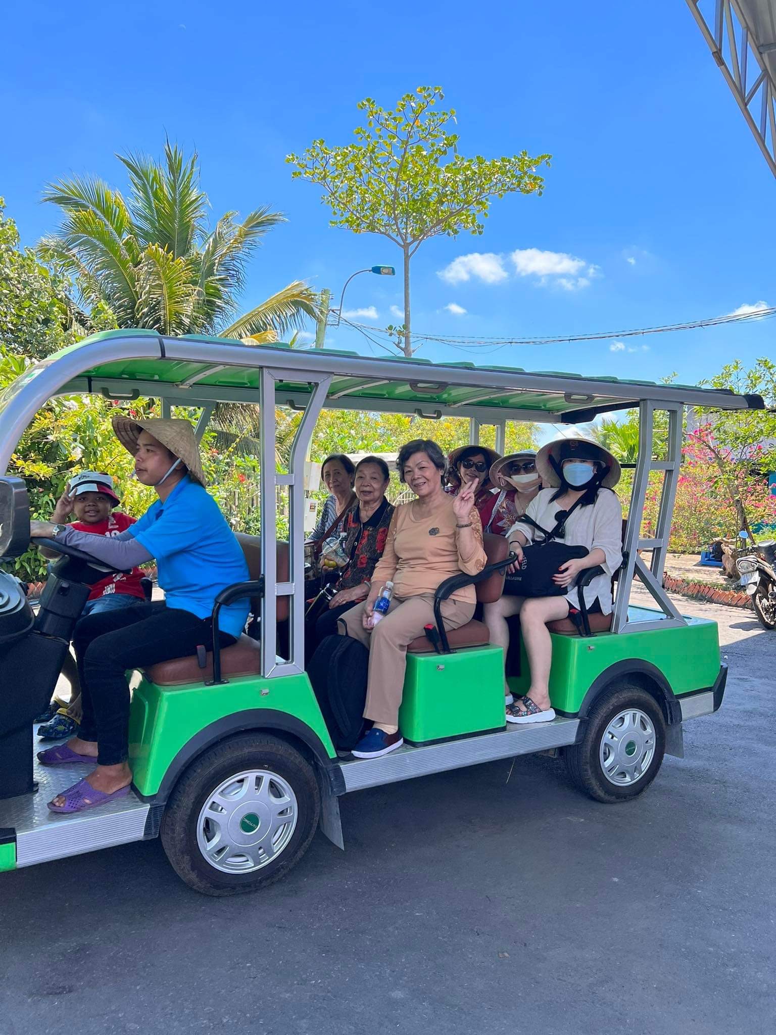 8:00 - Đi xe điện tham quan đường làng đến một số địa danh nổi tiếng trong huyện như Nhà thờ Cái Mơn, Chùa Ước, làng cây giống, hoa kiểng,...