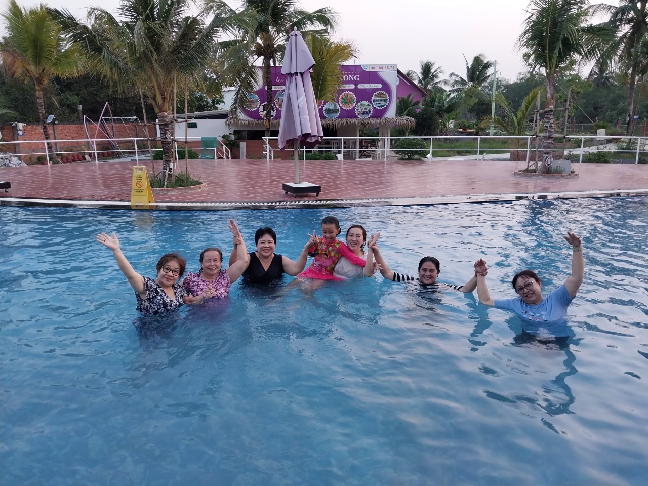 Cả gia đình cùng tham gia bơi tại hồ bơi ven sông của Rooster Mekong