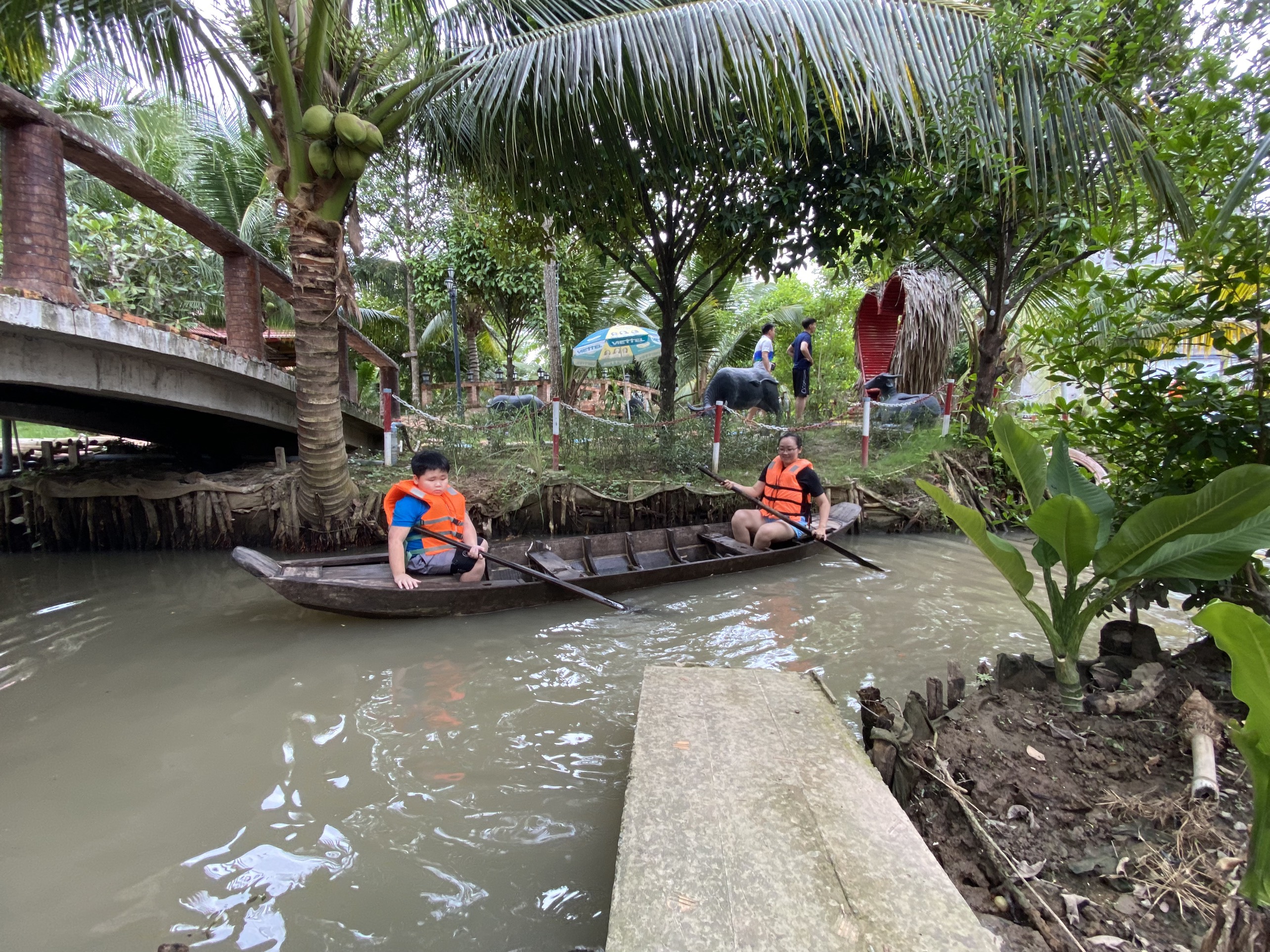 Du khách trải nghiệm chèo xuồng ba lá tại Rooster Mekong