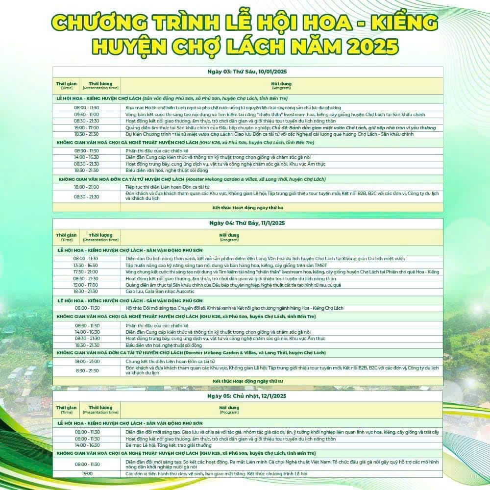 Lễ hội Hoa - Kiểng Chợ Lách sẽ mang đến cho du khách nhiều trải nghiệm thú vị và đáng nhớ trong dịp Tết Nguyên Đán 2025. Đây là thời điểm lý tưởng để bạn cùng gia đình và bạn bè tận hưởng không khí xuân tươi đẹp, hãy ghi chú thông tin này và chuẩn bị sẵn kế hoạch cho chuyến đi chơi Tết của mình nhé!