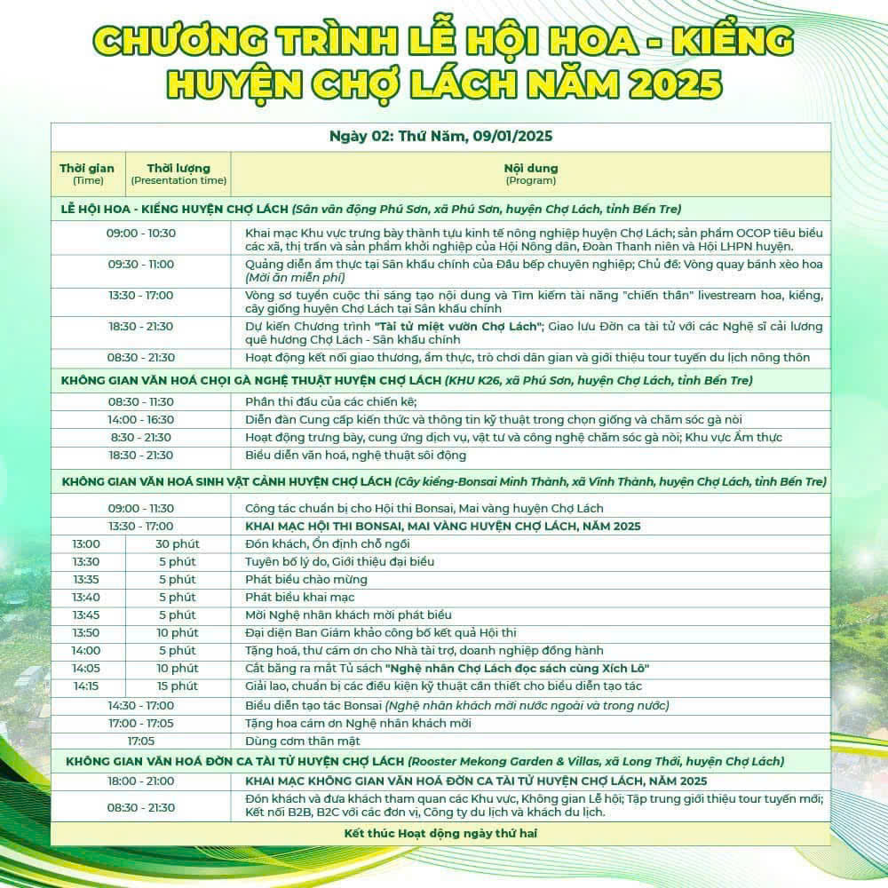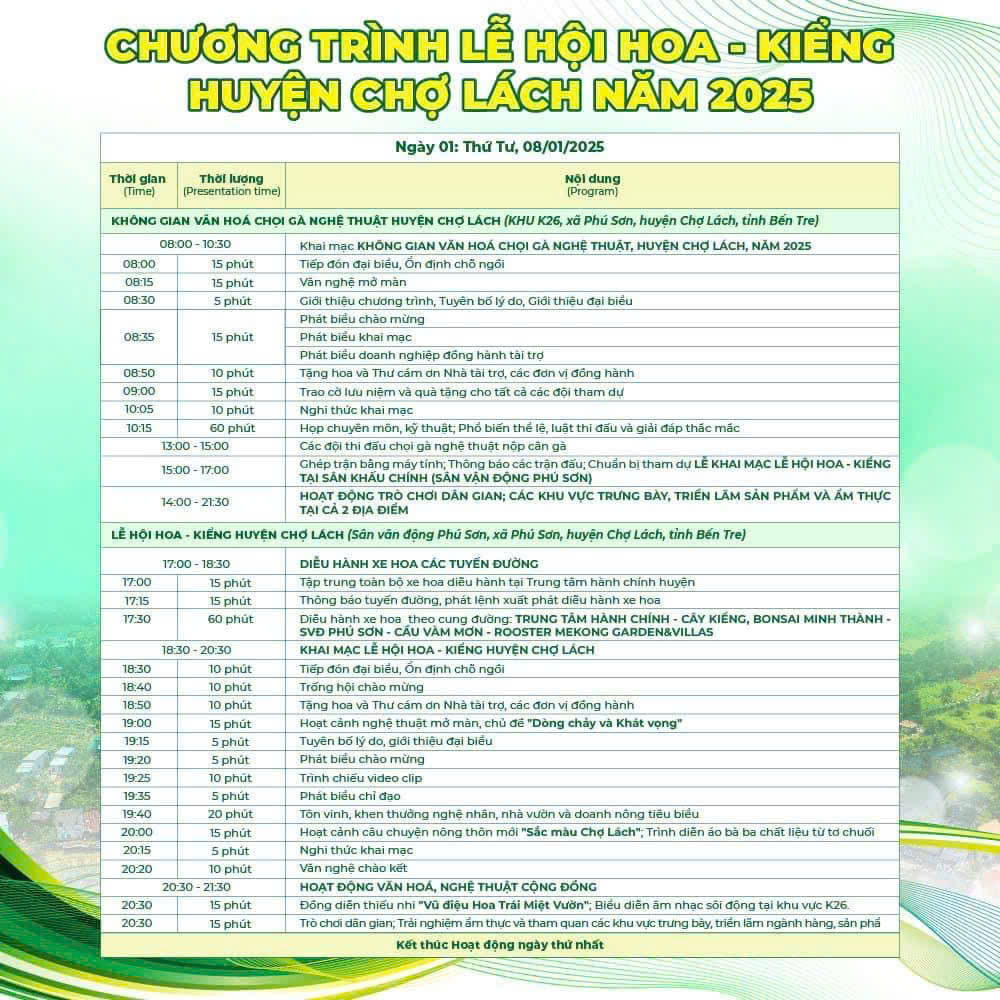 Lễ hội Hoa - Kiểng Chợ Lách dự kiến sẽ được tổ chức trong khoảng thời gian 5 ngày, bắt đầu từ ngày 08 đến ngày 12 tháng 01 năm 2025. Sự kiện này sẽ thu hút nhiều du khách và người dân địa phương tham gia để chiêm ngưỡng các loại hoa và kiểng đẹp mắt, cùng với nhiều hoạt động văn hóa đặc sắc khác.