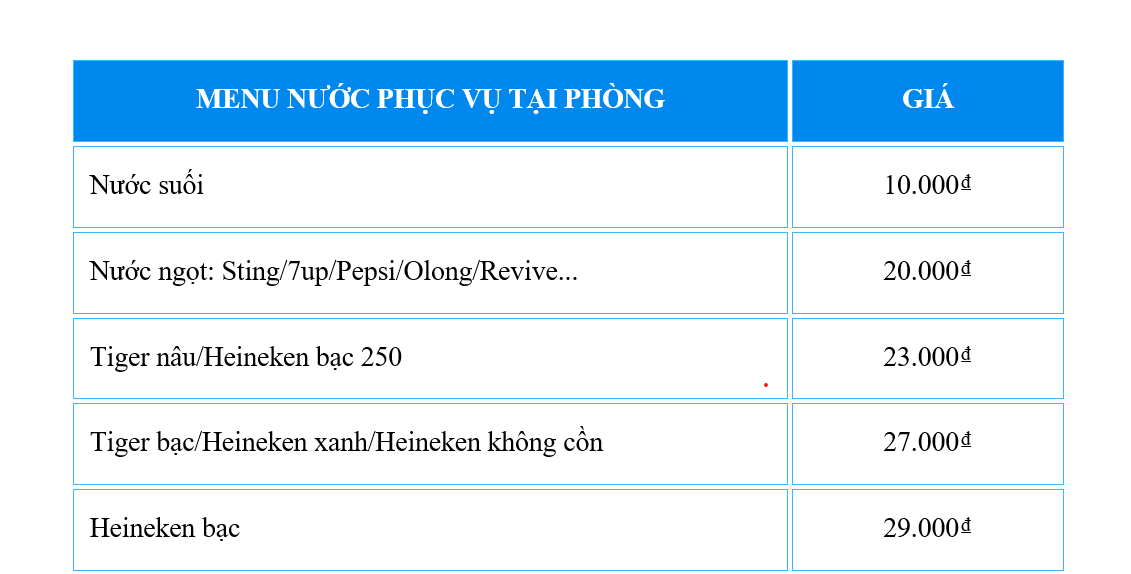 - Quý khách có nhu cầu sử dụng các loại đồ uống khác, vui lòng đi đến quầy Mini bar (cạnh hồ bơi) để tham khảo menu và order trực tiếp với nhân viên phục vụ.