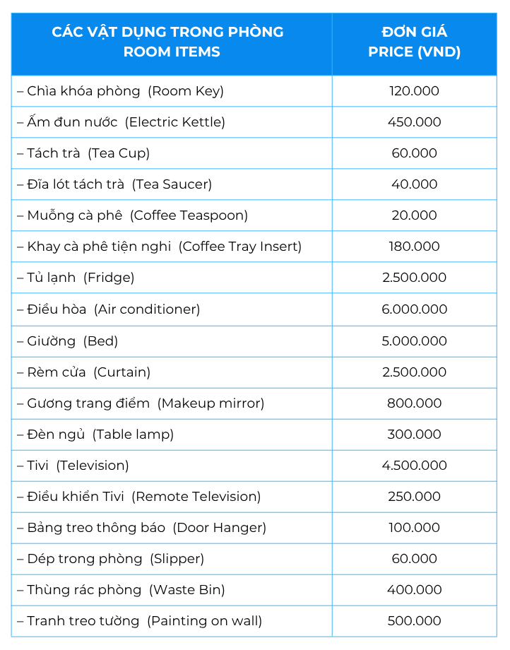 - Quý Khách sẽ bồi thường nếu gây ra những tổn thất, hư hại, mất mát tài sản, trang thiết bị của Rooster Mekong. Bảng giá vật dụng / trang thiết bị để trong phòng làm căn cứ tính giá bồi thường. Nếu các vật dụng, trang thiết bị nào không có trong danh sách thì tiền phạt sẽ được tính căn cứ vào giá thị trường của sản phẩm mới cùng loại.