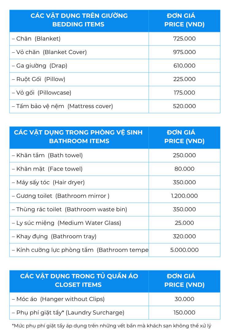 - Thời gian vệ sinh phòng từ 7h đến 17h mỗi ngày. Với mục đích tiết kiệm nguồn nước & nguồn năng lượng, chúng tôi sẽ thay khăn mặt & khăn tắm & khăn bơi mỗi 2 ngày 1 lần. Tuy nhiên, nếu Quý khách có yêu cầu thay tấm trải giường xin hãy đặt tấm thẻ lên giường. Khi cần khăn mới, xin vui lòng để khăn cũ vào bồn rửa mặt.
