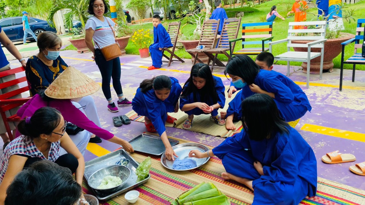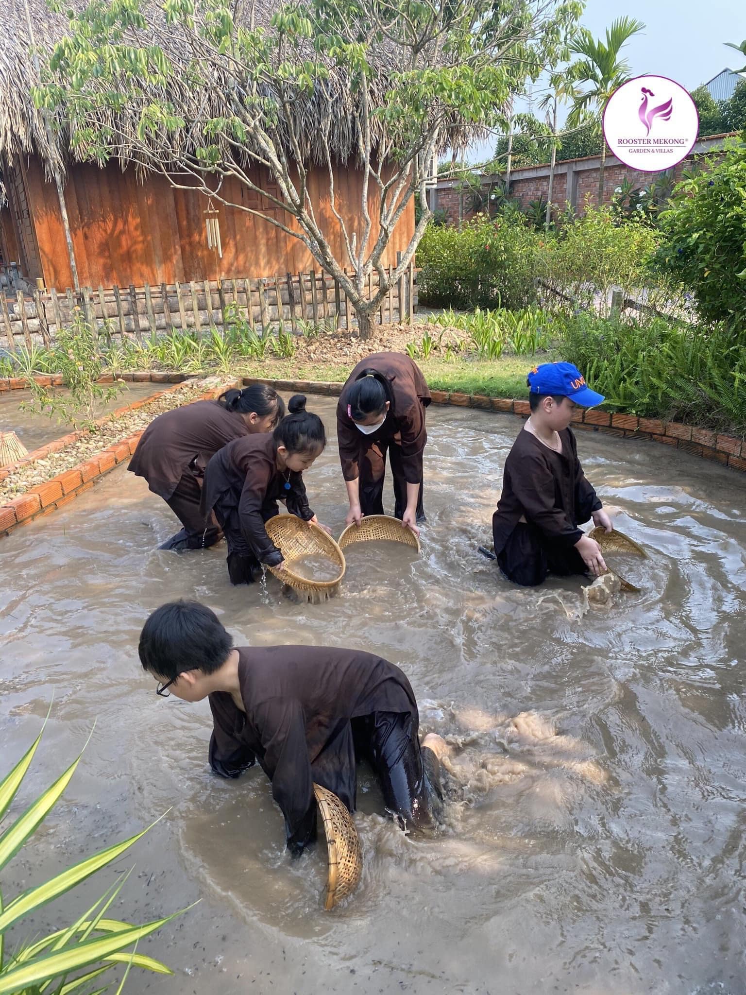 Thay trang phục bà ba và tham gia 1 trong 2 chương trình: 1/ Trải nghệm làm bánh và thưởng thức bánh xèo Miền Tây 2/ Trải nghiệm tát mương bắt cá (thưởng thức các món: cá lóc chiên giòn, cá lóc nướng trui,…) |