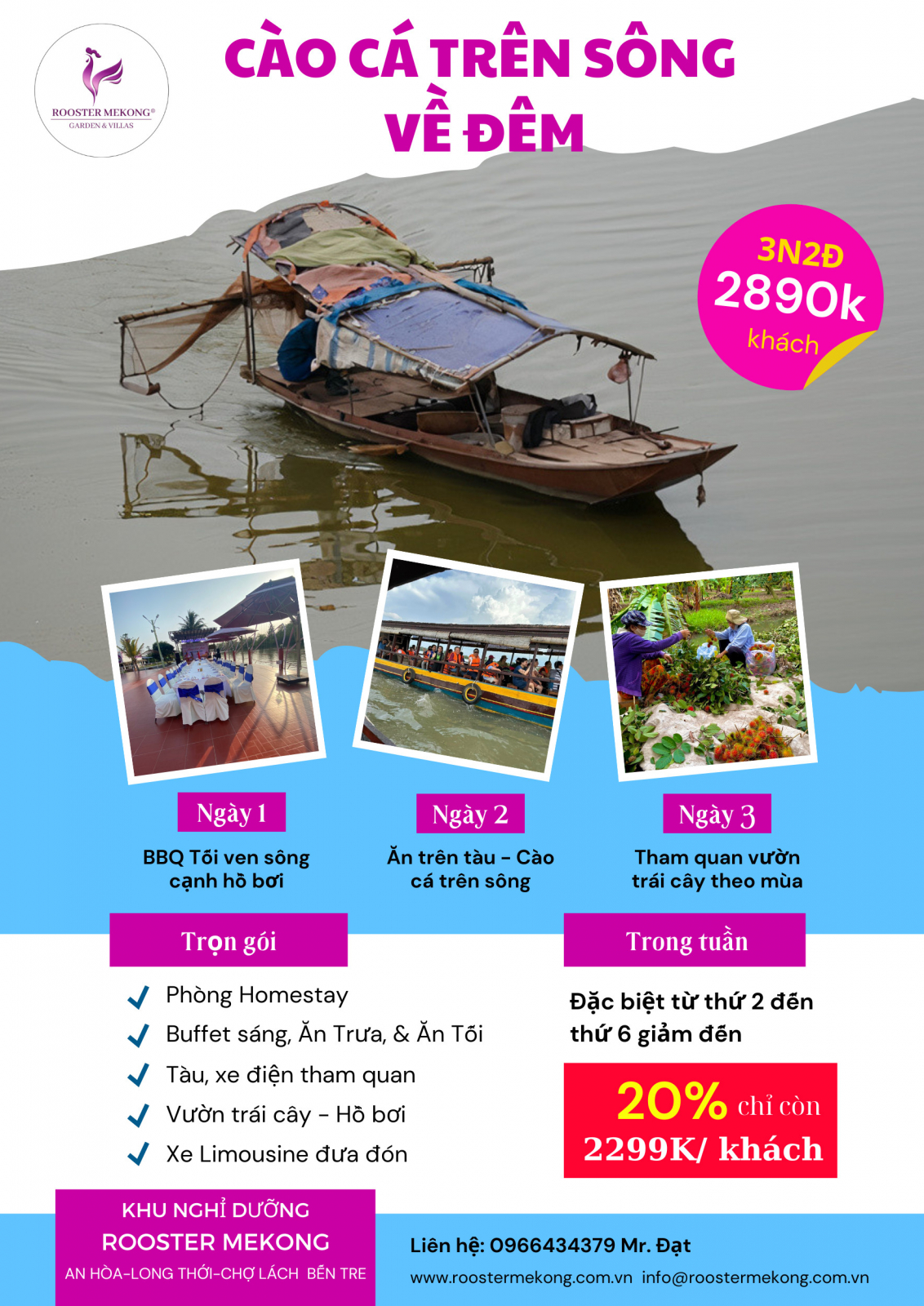 Về Rooster Mekong, không những du khách được hòa mình cùng bà con địa phương xuôi dòng Hàm Luông trải nghiệm “Cào cá trên sông về đêm” mà còn thưởng thức ẩm thực ngay trên tàu tạo nên cảm giác vô cùng thú vị. Bên cạnh đó, còn rất nhiều hoạt động hấp dẫn như tham quan vườn trái cây trĩu quả bằng tàu và xe điện, chèo xuồng ba lá, tát mương bắt cá,…Tất cả những hoạt động thú vị này đều đang chờ đón du khách khi tham gia Tour trải nghiệm đặc biệt “3 ngày 2 đêm” của Khu nghỉ dưỡng Rooster Mekong.