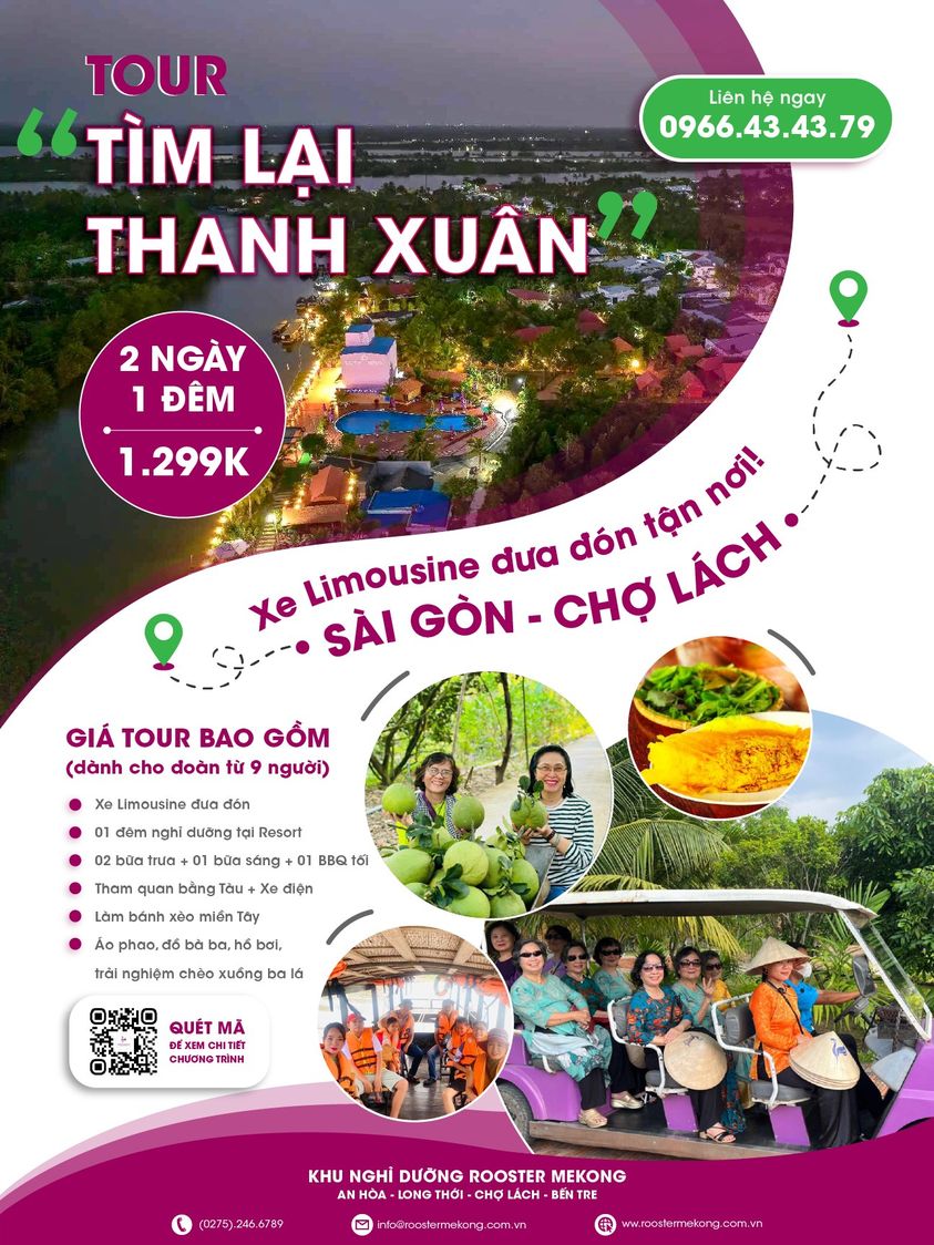 | - Giá tour: 1,299,000vnđ/khách ( đoàn từ 09 người lớn ) ( Trẻ em < 5 tuổi miễn phí, trẻ 6-10 tuổi 50%, 11 tuổi trở lên giá vé như người lớn. Bao gồm: • Xe Limousine 09 chỗ 7 ghế massage đưa đón 2 lượt TP.HCM - Rooster Mekong Phụ thu đưa đón tận nhà 1 điểm xuất phát từ số 7 đường số 9 phường Bình Thới Quận 11. (<10km: 500k. 11km -15km: 800k. 15km-20km: 1200k ) tính theo Google Maps • Các loại phòng: Bungalow, Rooster hoặc Riverside • 02 bữa Ăn trưa • 01 bữa sáng (bánh mì ốp la, hủ tiếu mực, bánh dân gian ) • 01 bữa tối BBQ • Trải nghiệm làm bánh xèo Miền Tây hoặc show bắt cá. • Tàu và xe điện tham quan • Các trò chơi dưới nước ( chèo xuồng ba lá…) Áo bà ba, áo phao • Vé hồ bơi Không bao gồm: • Chi phí phát sinh ngoài chương trình tour • Chi phí cá nhân khác |